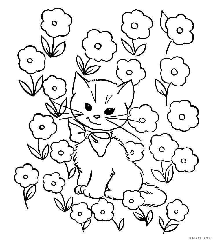 Flowers Cat Kitten Coloring Page